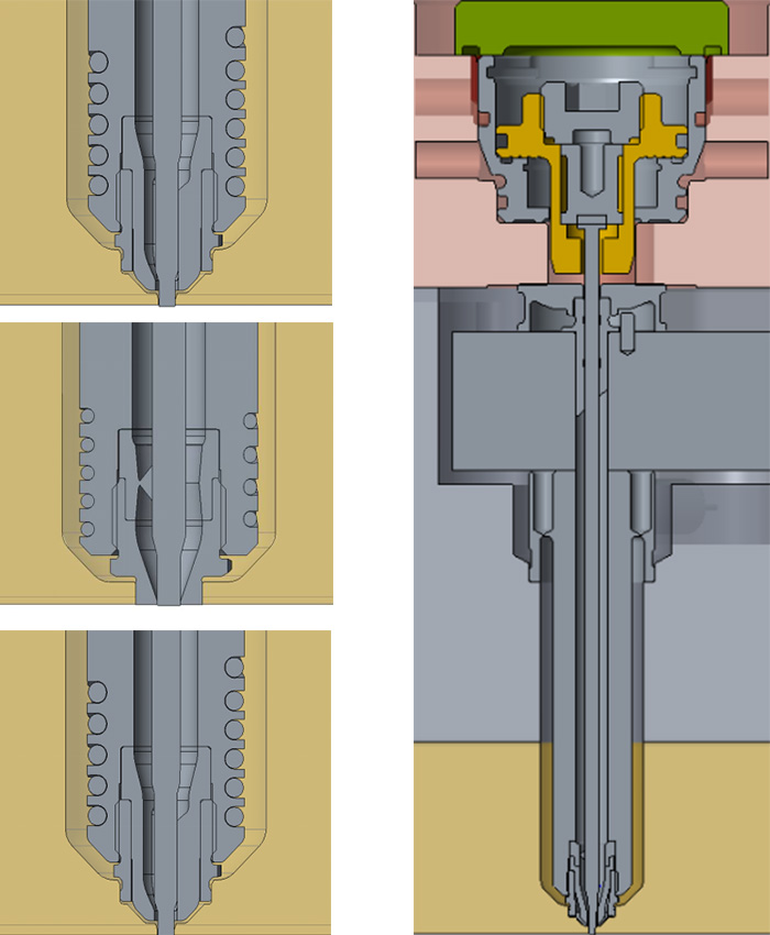 使用針閥式澆口,用閥針控制澆口閉合以便保持壓力時(shí)間。澆口凝固錢閥針關(guān)閉,與開放式澆口相比,針閥式澆口可縮短注塑周期。